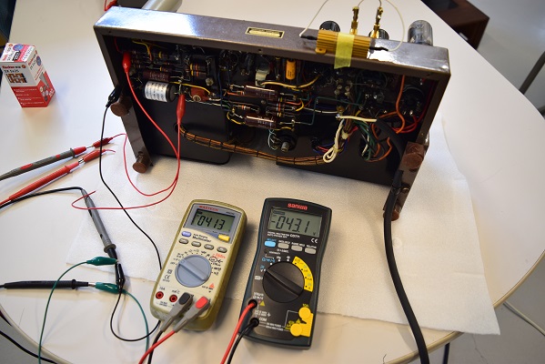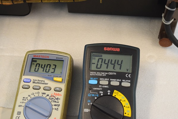 左テスターは高圧B電圧です。403Vを示し、少し低いですが時間の経過と共にもう少し上がって行きます。右はバイアスです。 -44.4Vで良好です。