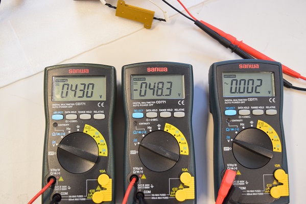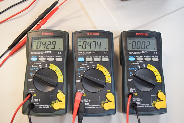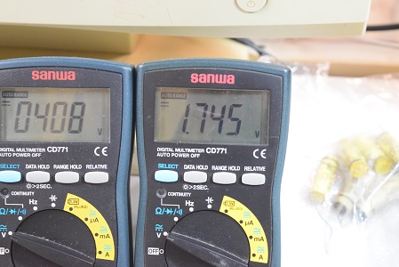 左テスターは高圧B1です。429Vで良好です。中央はバイアスC電圧です。こちらも-47.4Vで良好です。右テスターは出力電圧です。こちらは時間が経過しても変化はありません。