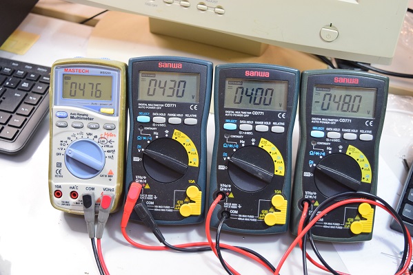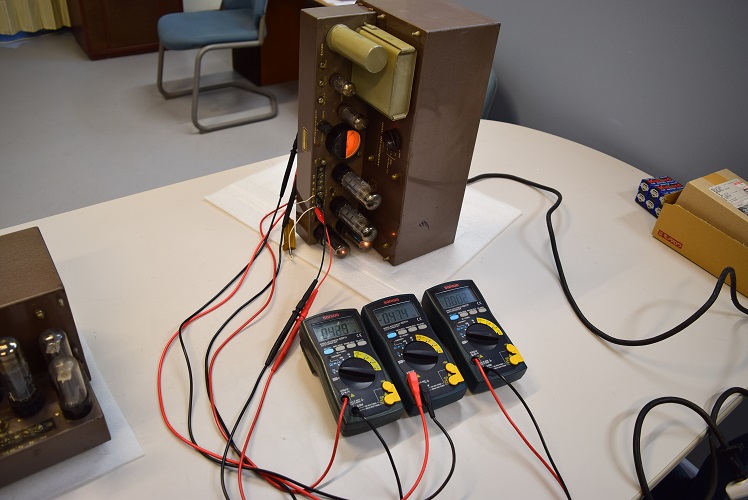 左テスターは高圧B1です。430Vで良い値です。中央はバイアスC電圧です。 -48.3Vで良い値です。右テスターは出力値です。まだ出力が出ていないようです。