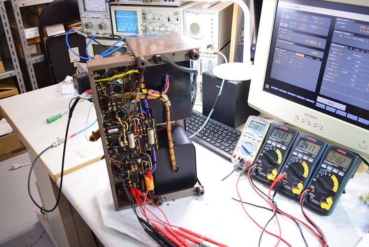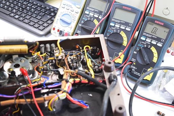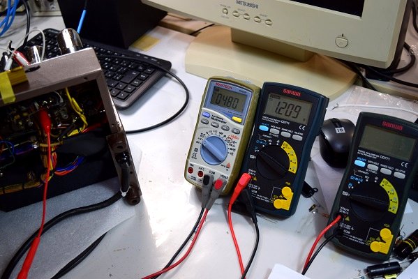 全て組上げ各部品も交換の後電圧調整と特性確認です。 しかし、これからが大変でした。メーターは振り切れ、メーター周りの電圧は完全に異常です。やはりメーターが切れる大きな原因がありました。