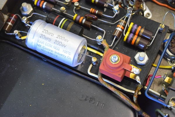 初段管のカソードバイパスコンも純正SPRAGUEの新品に交換しました。(青色)