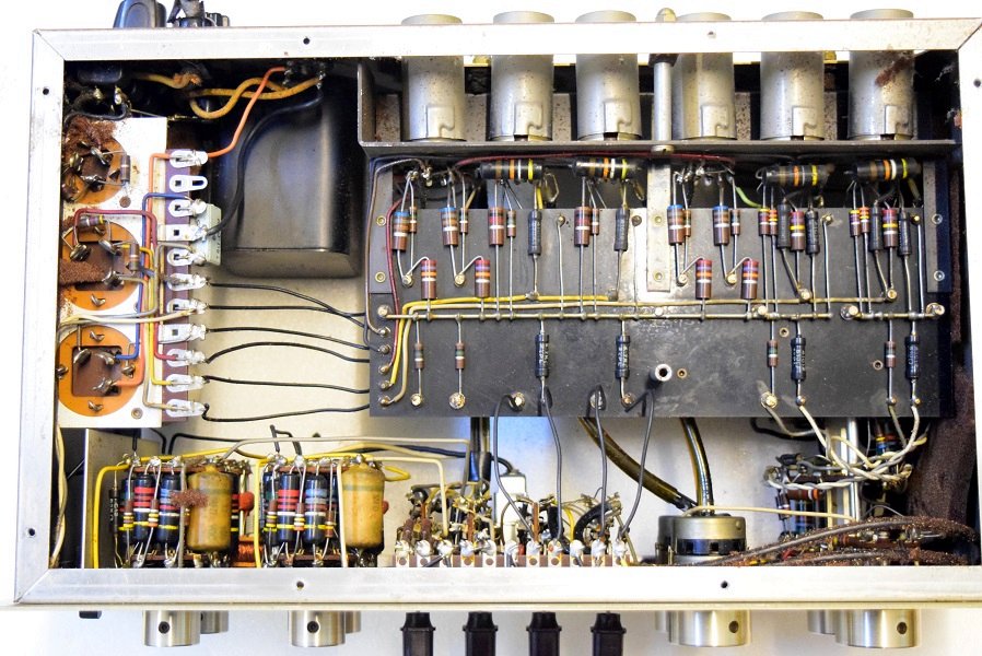 バンブルビーに亀裂が入っています。俵形2段積の段付きリード線が付いたカソードバイパスコンは2桁台以前の特徴です。この上に緑色シールド線が飛んでいます。本稿最下段でこの緑線について言及しています。