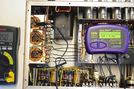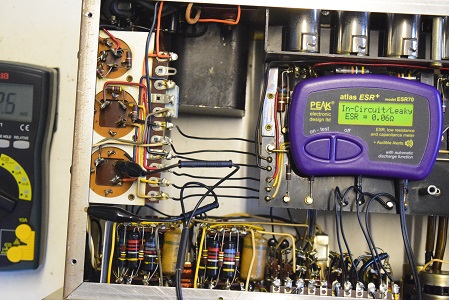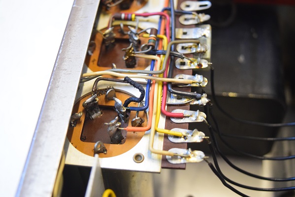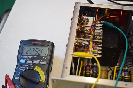 特に最初の検査で漏れ電圧測定ではまあまあ良かったものの静電容量が膨らんで周波数特性に影響のあった0.22uF/400Vを後で2本とも交換しました。画像では基板上右端から3,4本目です。ここが音に特に重要です。