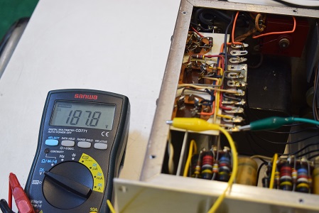 内部上部です。電源回路は全て交換しました。高圧セレン、電解ブロックコンデンサー3本。各電圧も上々です。