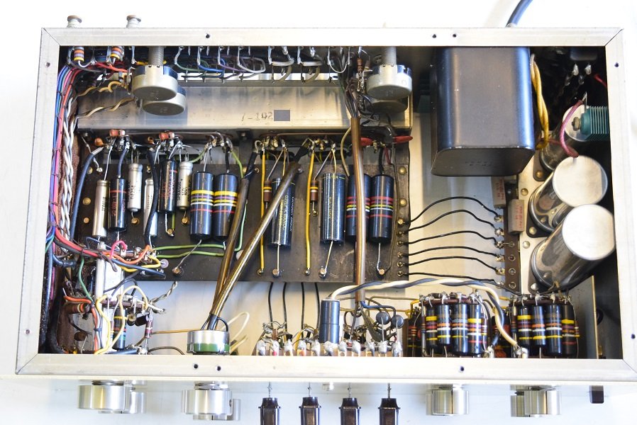 最初の音出しでは低域のトーンコントロールつまみの切替でドーンと言うスクラッチノイズが出なかったので0.22uF/400Vは大丈夫かなと思ったのですが、残念ながら全くの不良でした。(この画像では5.5と2.6の数字の書いてある右から3,4本目のものです)