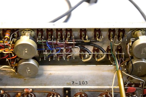 端子のアースと筐体との間の抵抗値を計ると結構あります。Marantz7の筐体はアルミなので経年劣化でアルミが腐食し端子と接触不良を起こします。この為、各端子のアース端子に渡りを掛け確実にアースが取れるようにしました。