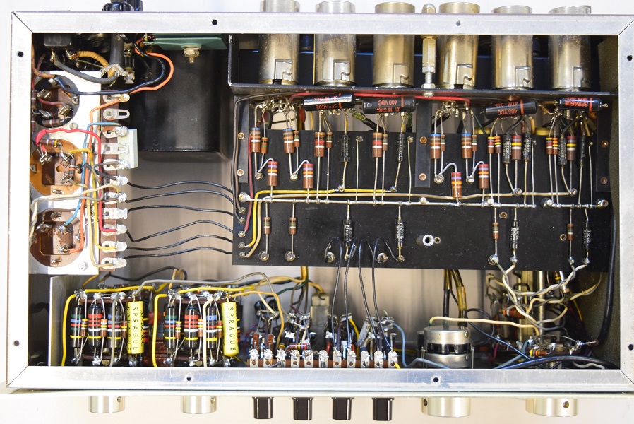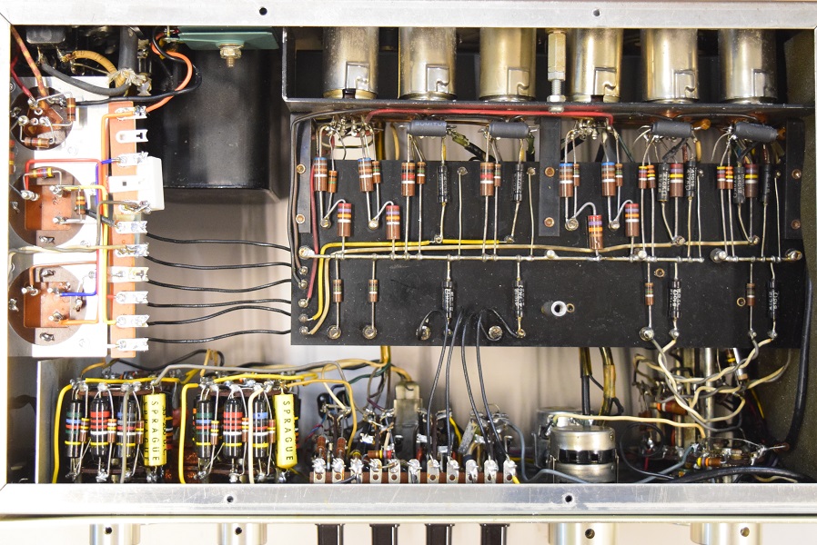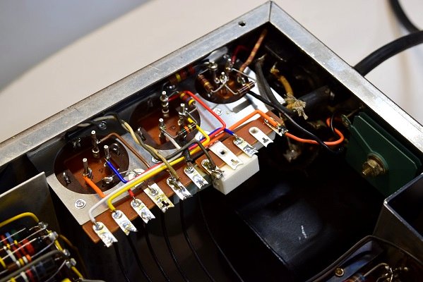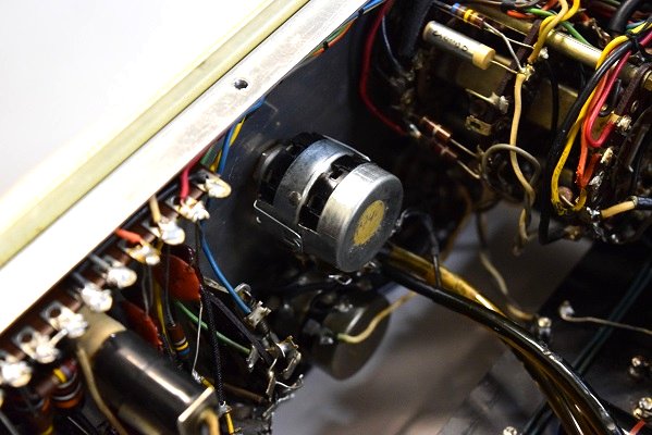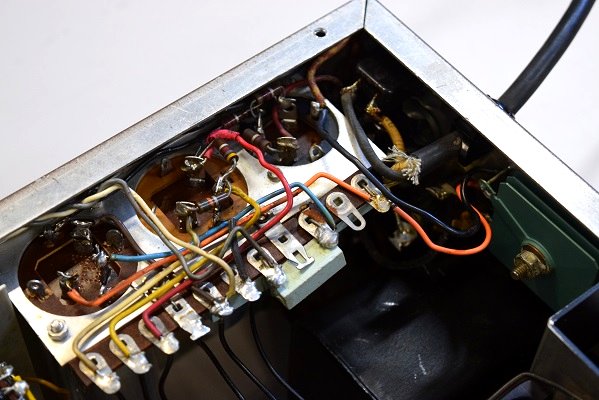 内部です。幾つか部品を交換されているようです。特に電源の電解ブロックコンデンサーがタイプの違うものに交換されています。高圧セレンも交換されています。ボリュームも見慣れないものに交換されています。