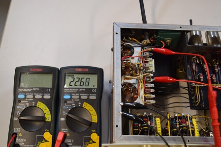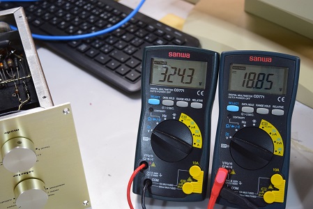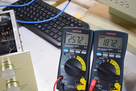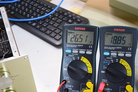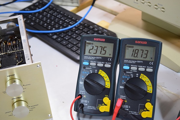 左テスターは高圧B1です。276.0Vで良い値です。右テスターはヒーター電圧です。こちらも18.72Vでまあまあの状態です。