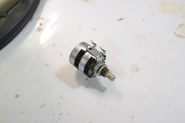 問題のメインボリュームです。大きなガリが出たので代品に交換されました。抵抗値や特性が全く違うものなので社内のジャンクBOXから適当なものを拾って付けられたようです。
