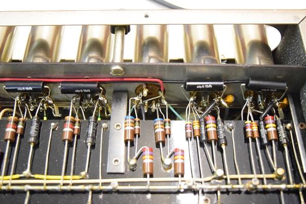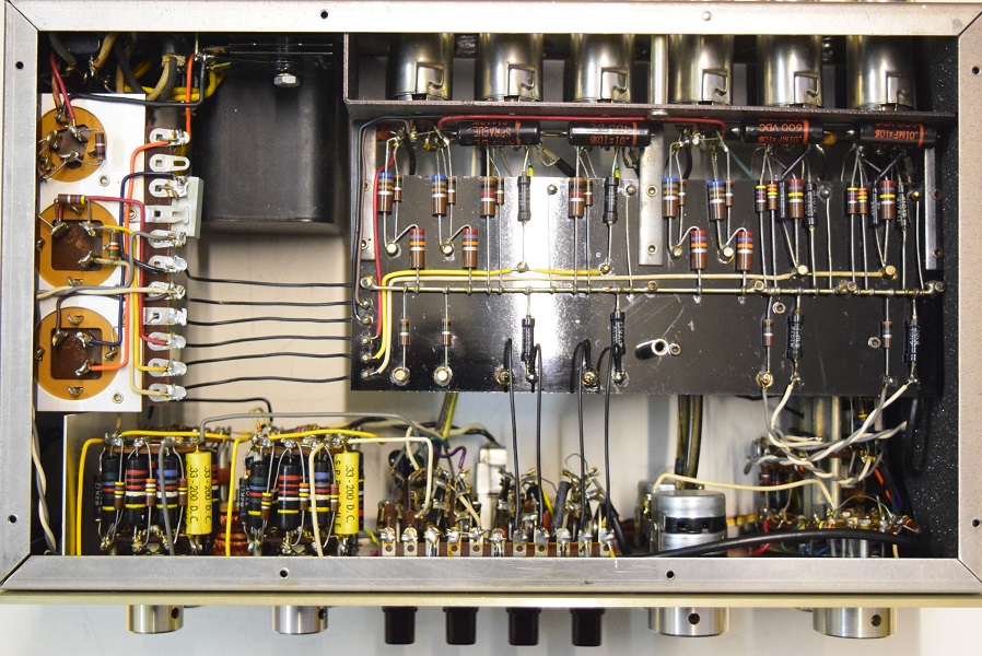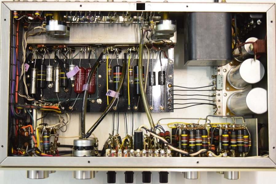 内部です。カップリングコンデンサーを全てブラックビューティーに交換されています。高圧セレンも交換されていますが電解ブロックコンデンサーとカソードバイパスコンはオリジナルのままです。