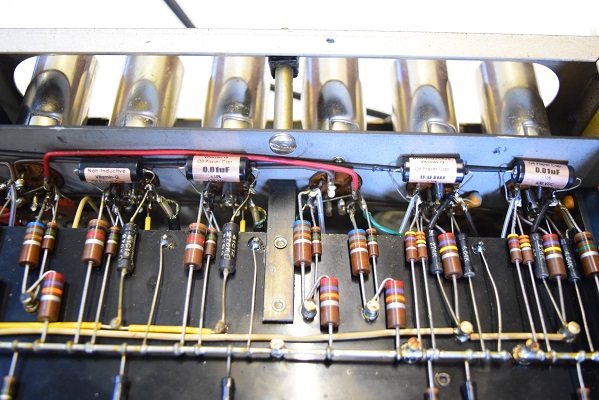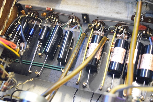 交換した赤い高圧セレンとセレンの下にφ25のブロックコンデンサーが見えます。このφ25は極めて貴重な物で他ではもう手に入らないものです。また手前の長いφ35低圧のブロックコンデンサーも全く手に入りません。この為、他のレストア屋はどれも他の代品で改造します。本機も改造されていました。