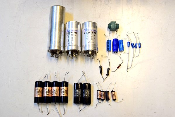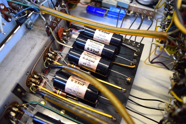 よく見ると交換された代品のカップリングコンデンサーは値が違います。本来0.22uFの所を画像の4本が0.33uFです。これではCR特性が変り音が変わってきます。