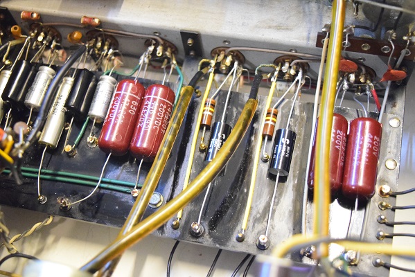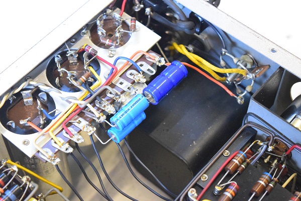 裏面です。電源回路の低圧セレンはダイオードに交換されています。低圧ヒーター回路に青い電解コンデンサーを3本追加されています。横一列の小さなカップリングコンデンサーも代品のビタミンQに交換されています。