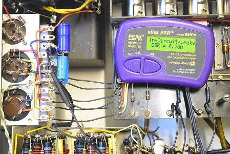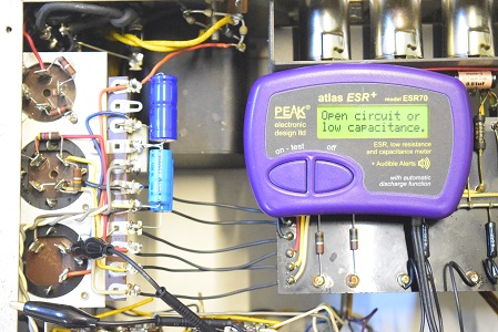 こちらは低圧の電解ブロックコンデンサーで未交換のオリジナルです。一部で計測不能の表示があり完全に不良です。