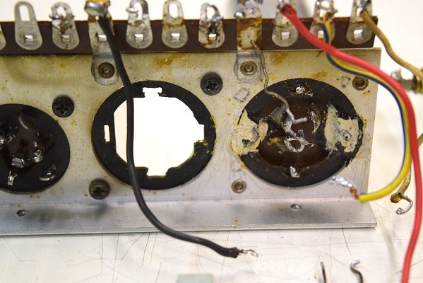 中央の電解ブロックコンデンサーのみ再使用の為外しました。右の低圧はかなり前に白いボンドで固定されているので外せません。