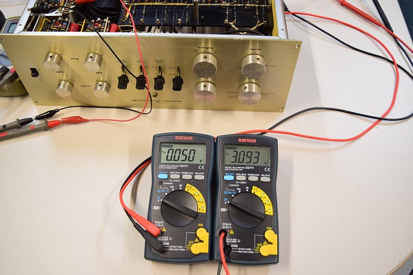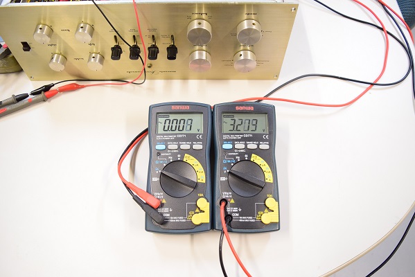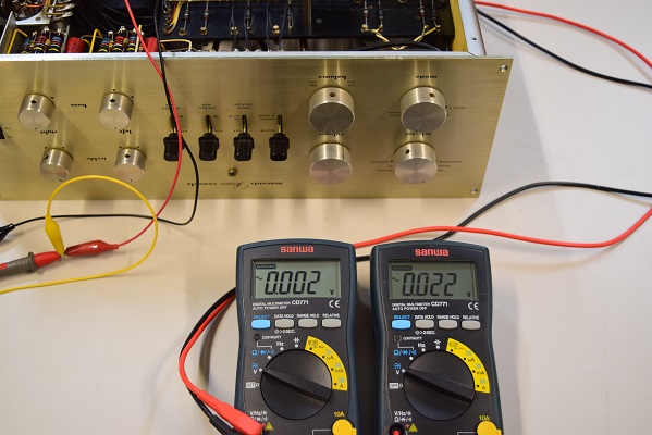 残留ノイズです。ミリバルのメーター読みで、右が0.002V、左は0.0025Vで良好です。