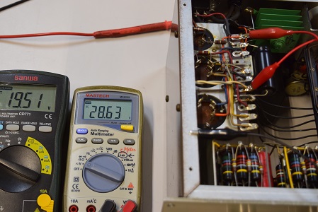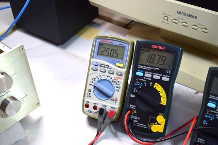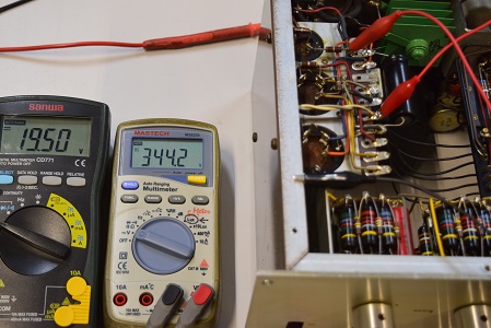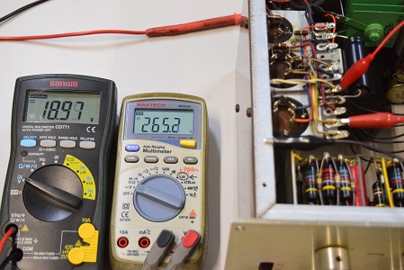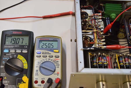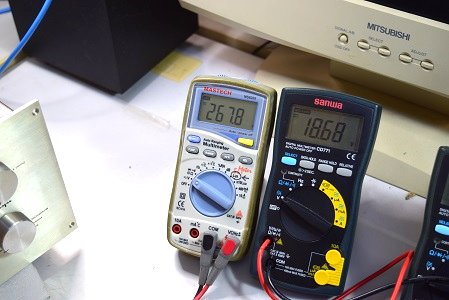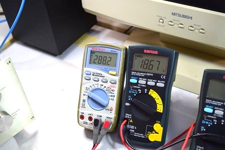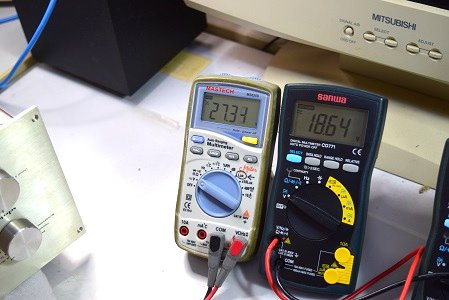 左の白いテスターは高圧B1です。288.2Vを示しやはり少し高いようですが許容範囲です。右テスターはヒーター電圧です。18.67Vで良い値です。