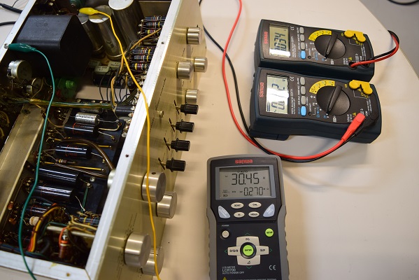 左テスターはヒーター電圧です。良い値です。右の白テスターは高圧B1です。292.3Vで高過ぎます。