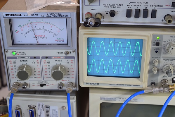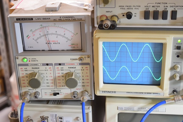 出力波形チェックです。綺麗な波形が出ています。周波数特性、歪率とも良好です。