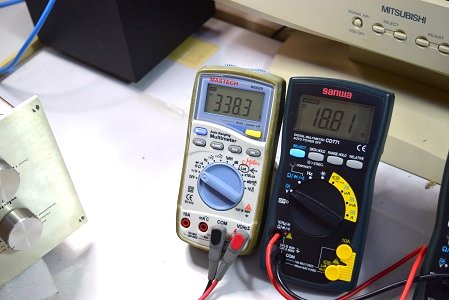 電源を入れて左右の残留ノイズ電圧を計ります。やはり右チャンネルに異常な電圧が出ています。この電圧(3V超)では大音量のノイズが出ていることになります。