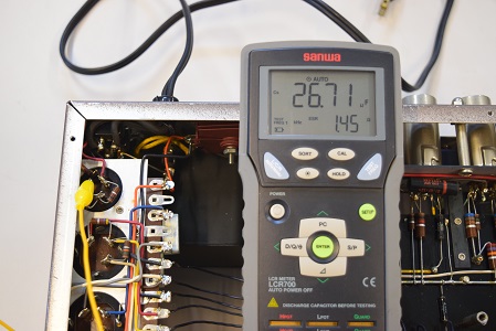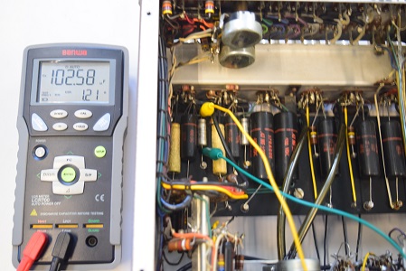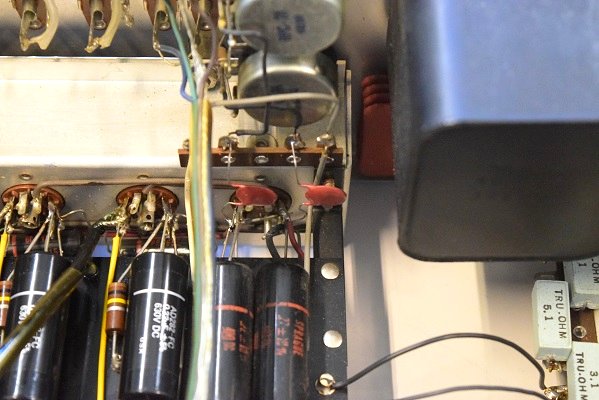 以前のレストアでカップリングコンデンサーを全てブラックビューティー(160P)に換えられていましたが、今回音に特に影響のあるところのみ音の良いコンデンサーに交換しました。フォノイコはRIAA偏差を決めるコンデンサーが劣化して値が変わっていたのでブラックビューティーからマイカコンデンサーに交換しました。