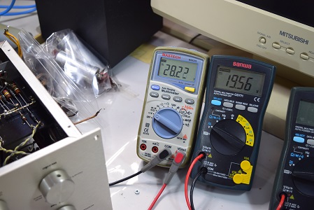 左の白いテスターは高圧B1です。277.2Vで良い値です。中央のテスターはヒーター電圧です。19.65Vで極めて良い値です。