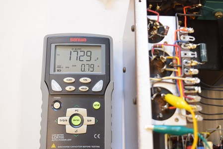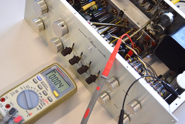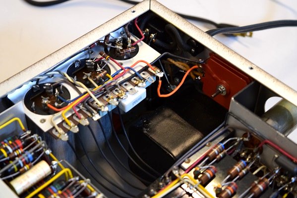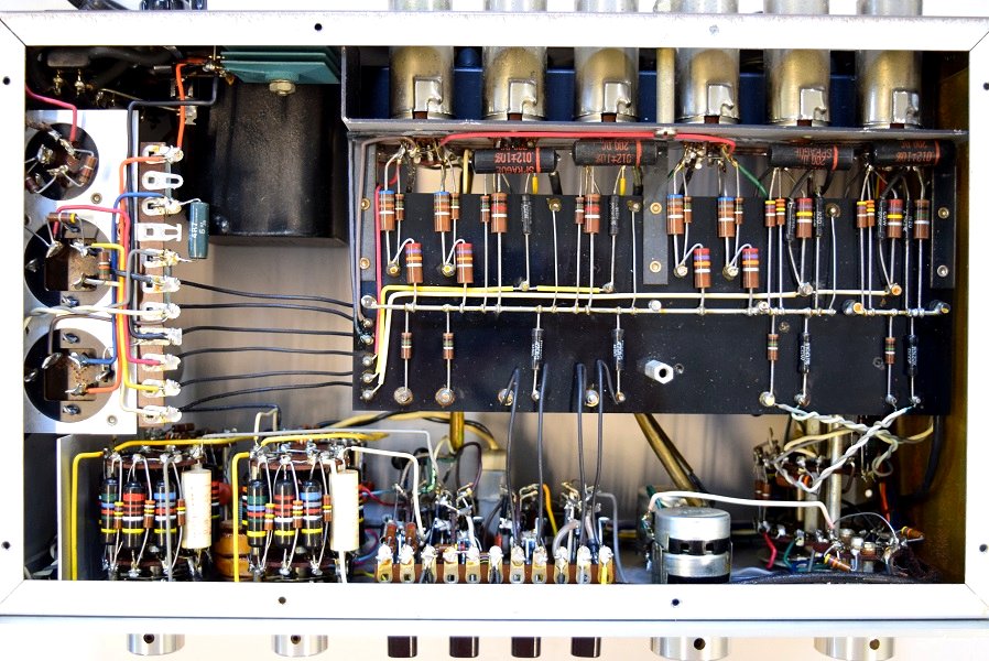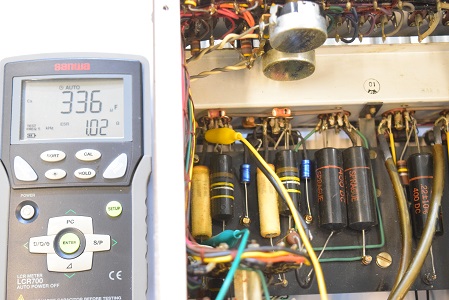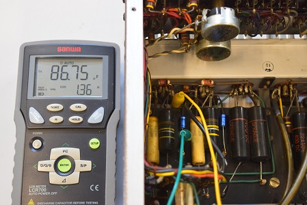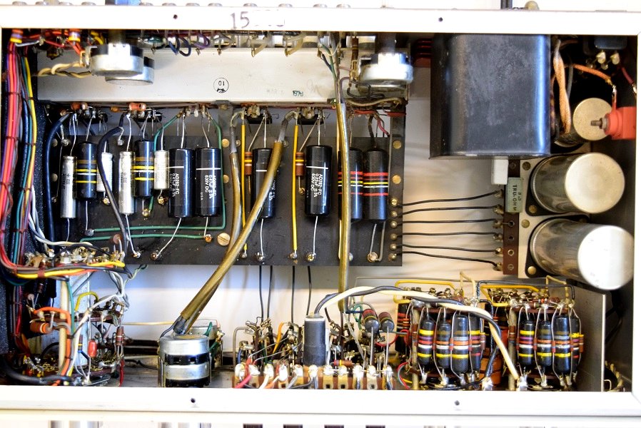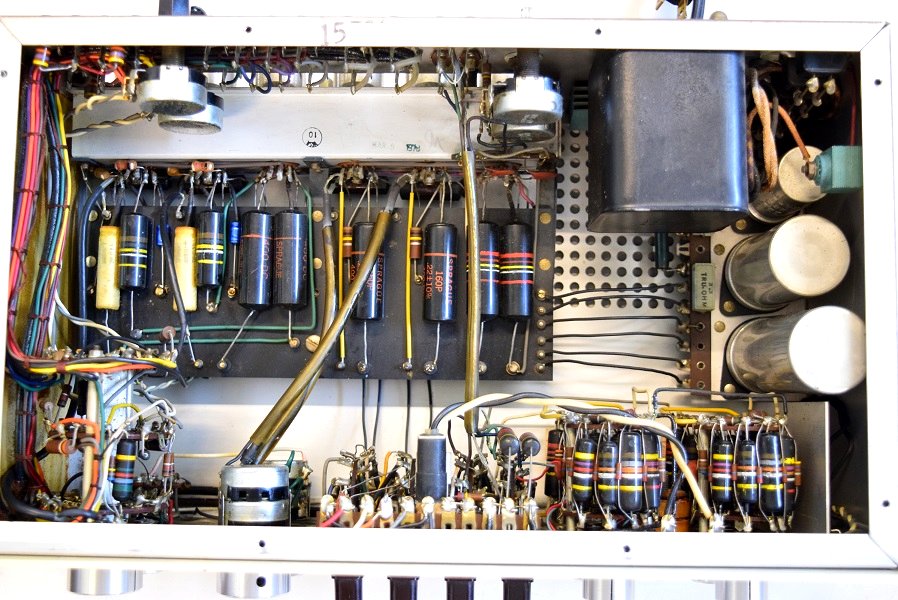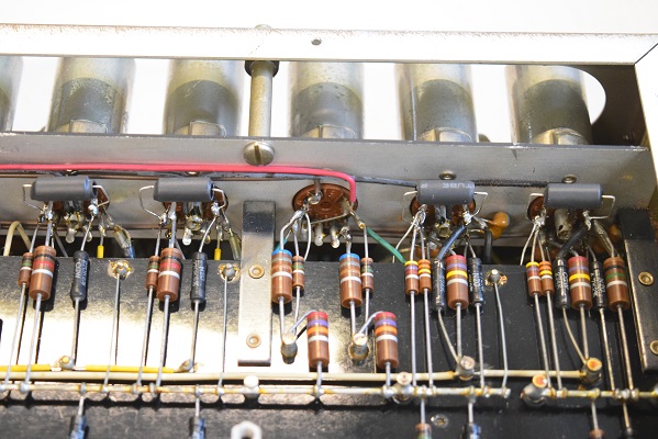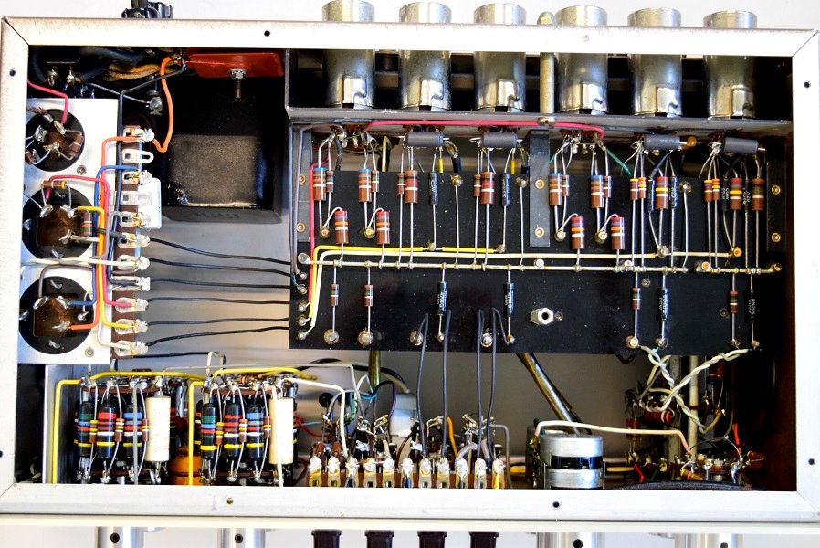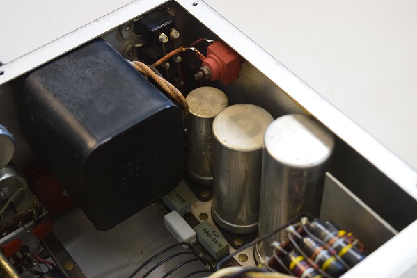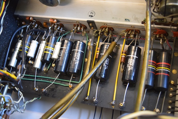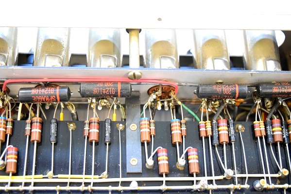 内部です。以前他でのレストアで最小限の部品交換をされたようです。 しかしよく見るとカソードバイパスコンが値の違うものに交換されています。合う部品が無かったのでしょうが、ここは音全体に影響するところなので正規の値に直したいものです。