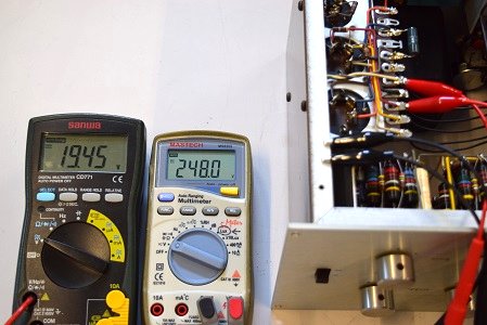 左テスターはヒーター電圧です。 19.45Vで良い値です。 右の白テスターは高圧B1です。 248.0Vで非常に低い値です。