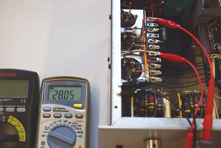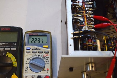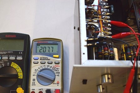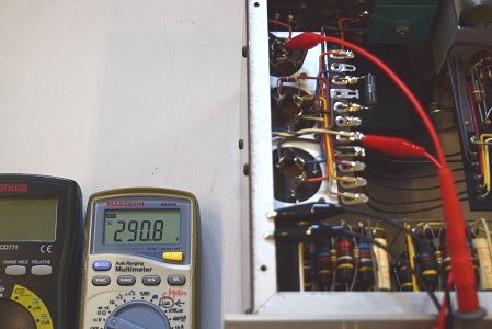 左の白テスターは高圧B1です。 280.9Vで良い値です。右テスターはヒーター電圧です。 19.07Vで良い値です。
