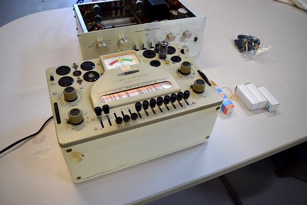 別便でお送り頂いたストック品はどれも余り良くないようです。当工房の真空管試験機では58以下が廃棄値になります。ただ今計測している値は62程なのでかなり使い込まれています。通常良品は75〜85位を指します。