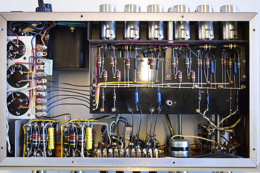 上から見た内部で、基板上にバンブルビーコンデンサーの良品が並んでいます。大変状態の良いクラロスタット製ボリュームと右端に青いセレン整流器があります。