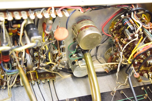 裏面です。左下の黄色いコンデンサーも今回交換しました。純正SPRAGUEのNOS品です。S/N 10500〜12000番台辺りまで付いている音の良いものです。この他、低域のNFBの値を決める抵抗も正確な物に交換しています。