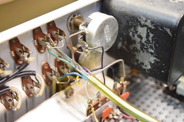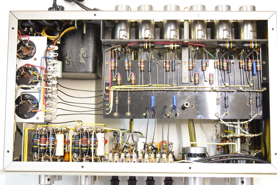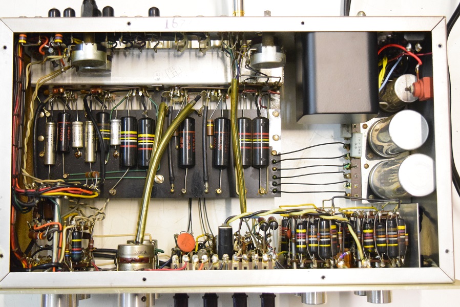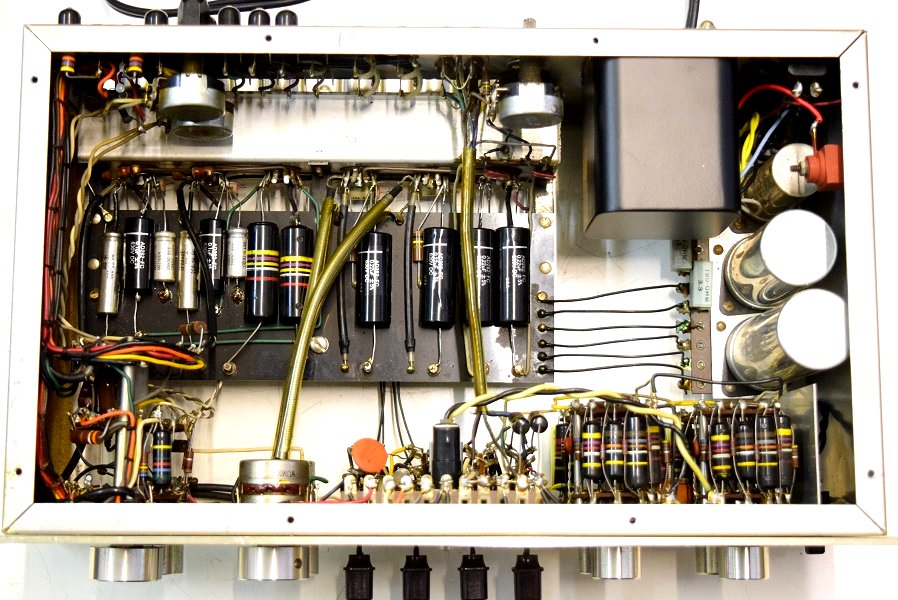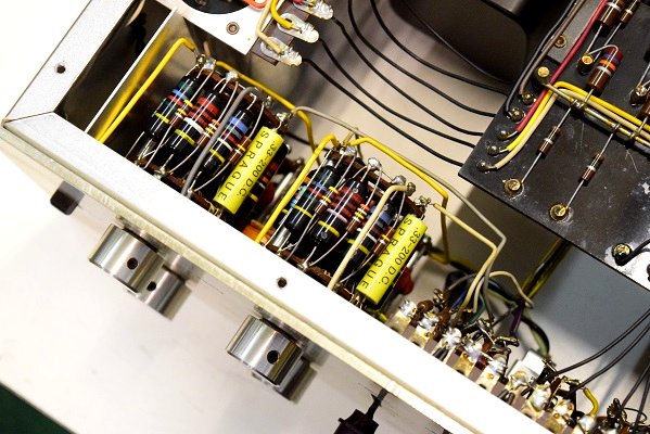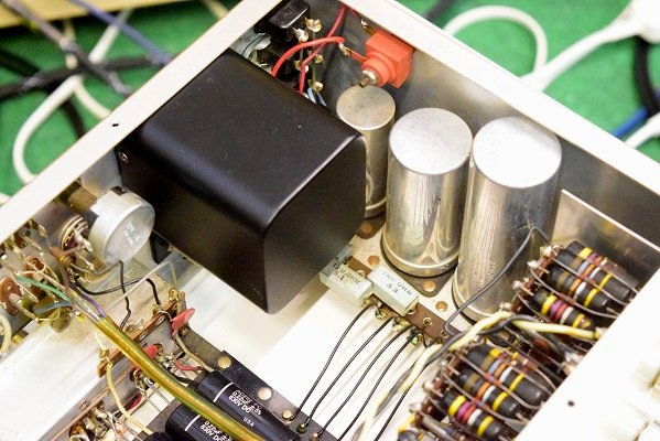 電源トランスを特注品に交換し高圧セレンも交換しました。フォノイコのカソードバイパスコンもMarantz7純正SPRAGUEの新品に4本とも交換しました。セラミックコンデンサーも純正品に交換しました。この他のカップリングコンデンサーは特に問題は無いのでそのままです。シールド線の焼け焦げた状態は少し手を加えることにより問題はありません。