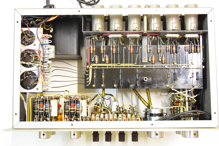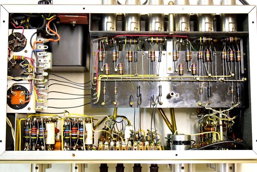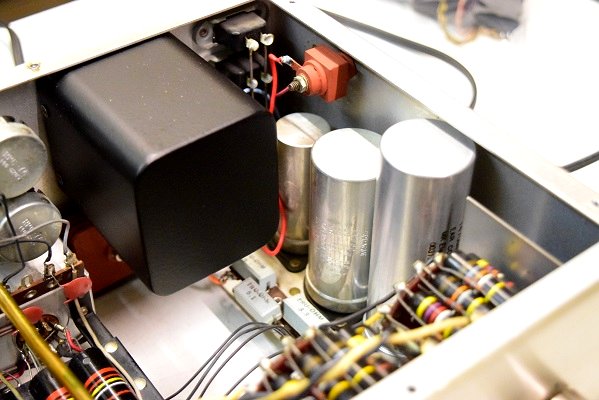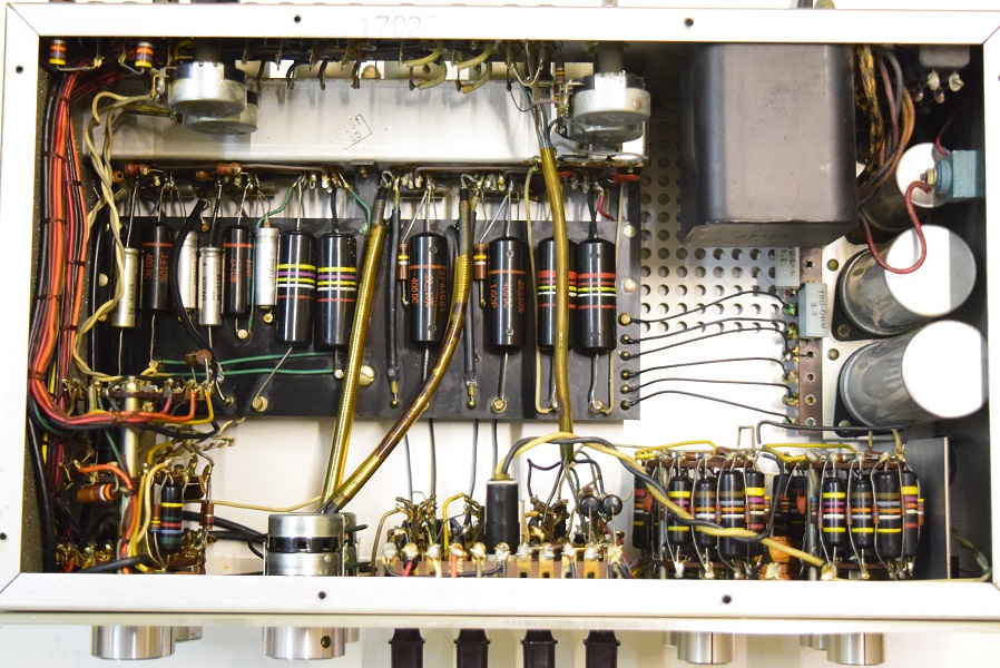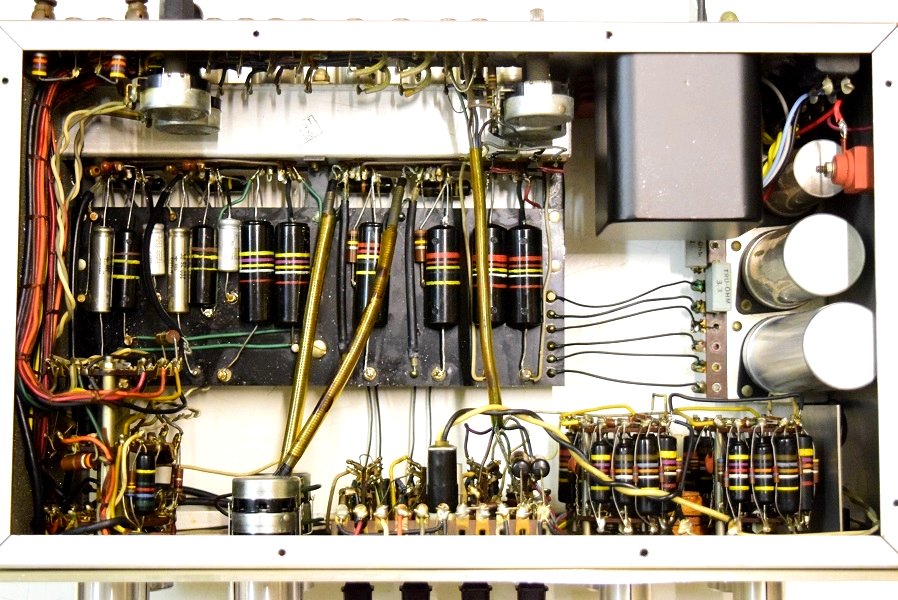 内部です。基板の上のカップリングコンデンサーは全て良品のバンブルビーに交換しました。フォノイコのカソードバイパスコンも4本ともMarantz7純正SPRAGUEの新品に交換しました。セラミックコンデンサーも純正SPRAGUEの正規品に交換しました。電源回路は電源トランスを特注品に交換し、高圧セレンも交換しました。電解ブロックコンデンサーは低圧φ35をオリジナル仕様の新品に交換しました。