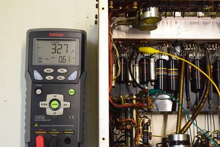 裏面です。電源回路は低圧セレンを交換しました。真空管の後の横に4本並んでいる小さなカップリングコンデンサーも良品バンブルビーに全て交換しました。真空管ケースも腐食が激しかったので当工房でバレル研磨機に掛けて磨きました。