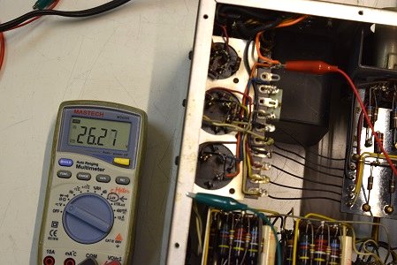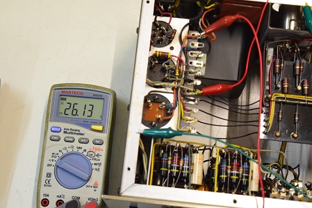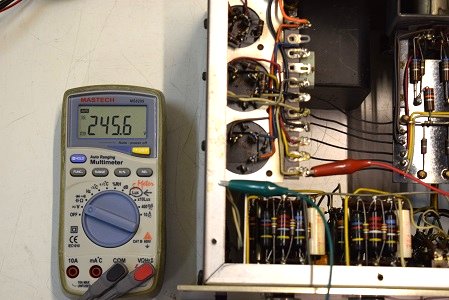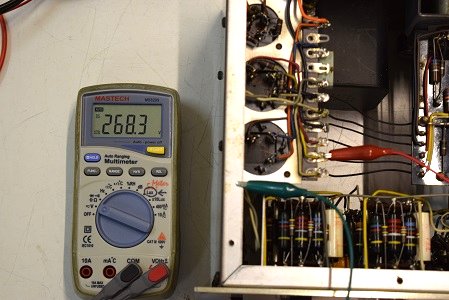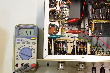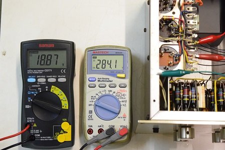左テスターはヒーター電圧です。18.87Vを示し良好です。右の白いテスターは高圧B1です。284.1Vで非常に良い値です。