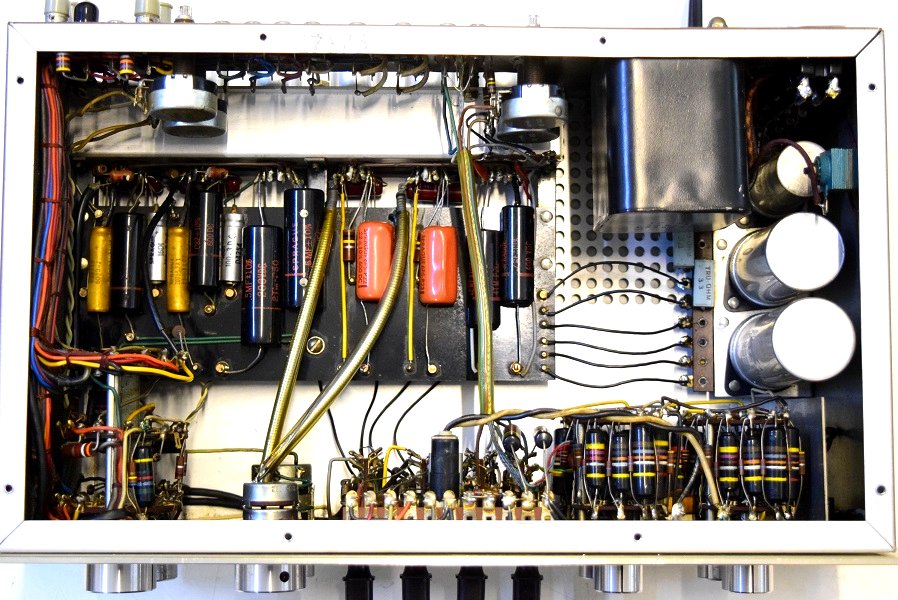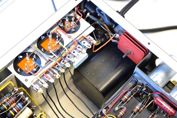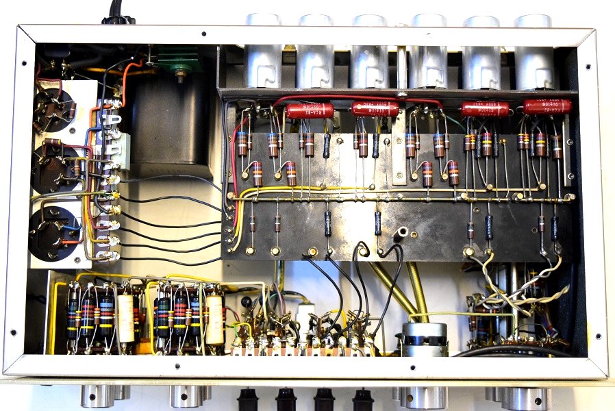 裏面です。電源の抵抗を全て高級品に交換しました。各真空管のプレート抵抗も同じく高級品に交換しました。これにより音の通りがよくなり歯切れの良い音が堪能できます。