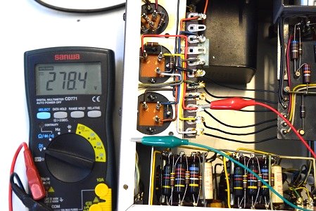 電源トランス2次側です。AC280.8Vを示し一応良好です。
