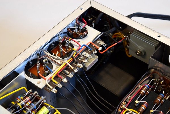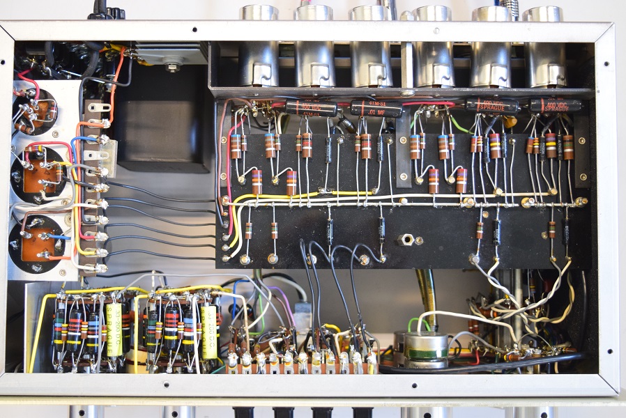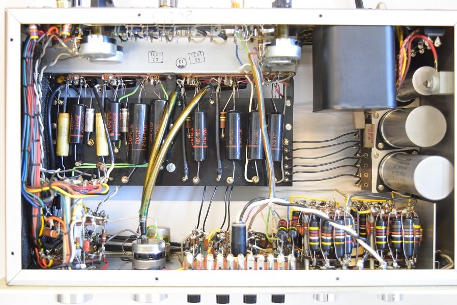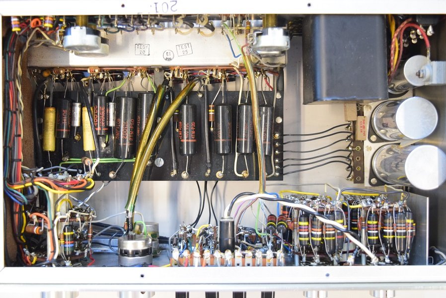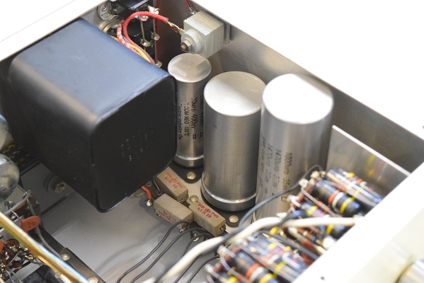 内部です。結構前にどこかでレストアされ、カップリングコンデンサーは全てブラックビューティー160Pの交換されています。電源回路も高圧2段目のブロックコンデンサーを交換されています。メインボリュームもメキシコクラロに交換されています。