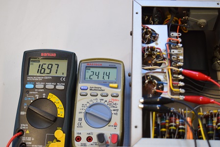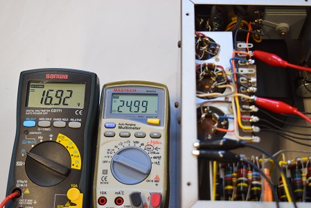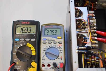 左テスターはヒーター電圧です。 16.93Vで少し低い値です。右の白いテスターは高圧B1です。 279.2Vで良好です。