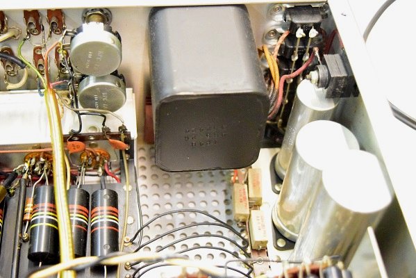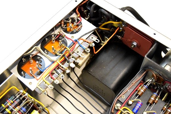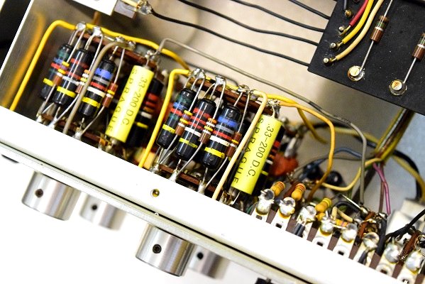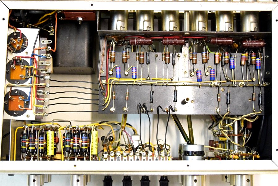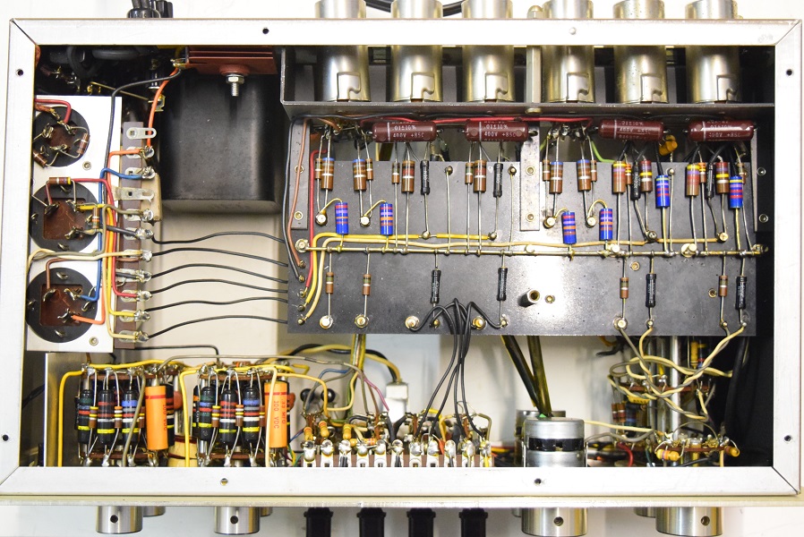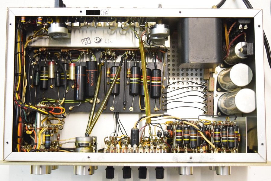 内部です。基板上のカップリングコンデンサーは全て交換しました。フォノイコのカソードバイパスコンも4本とも純正SPRAGUEの新品と交換しました。RIAA偏差のコンデンサーも交換しました。ラインのセラミックコンデンサーも純正SPRAGUEの新品に交換しました。
