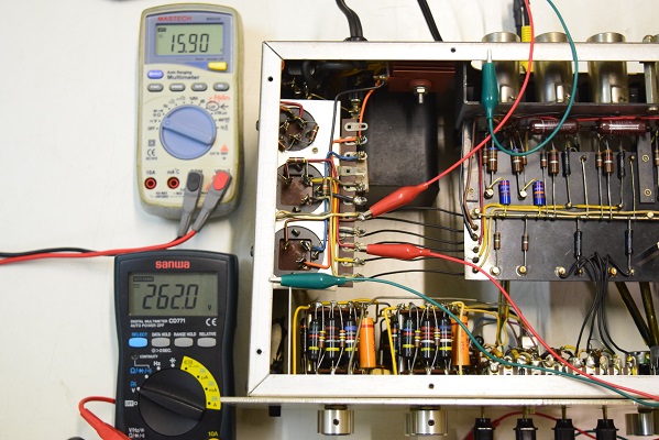 上の白いテスターはヒーター電圧を示します。15.9Vとかなり下がっています。