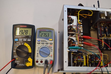 左テスターはヒーター電圧です。19.28Vで良好です。右テスターは高圧B1です。275.3Vで良好です。