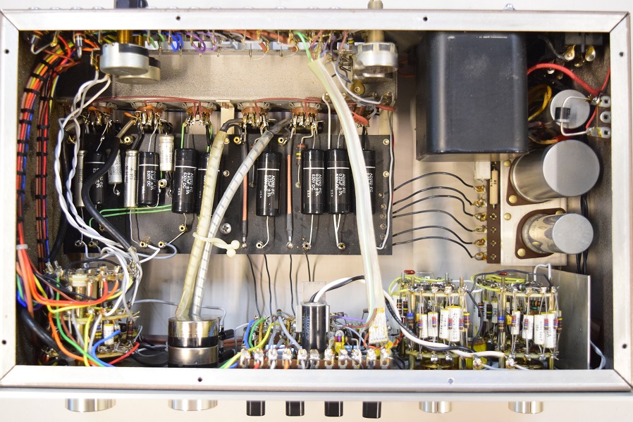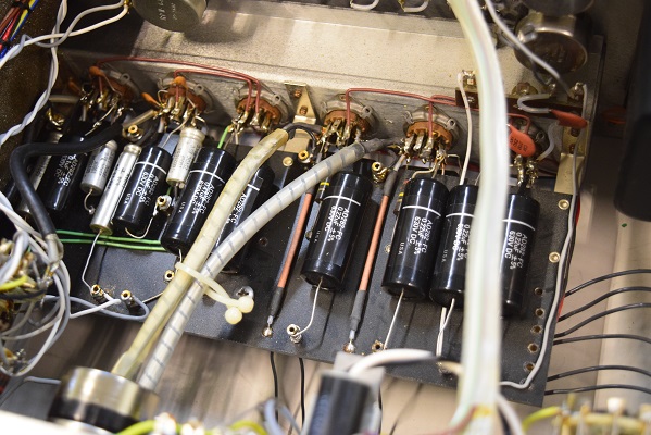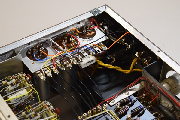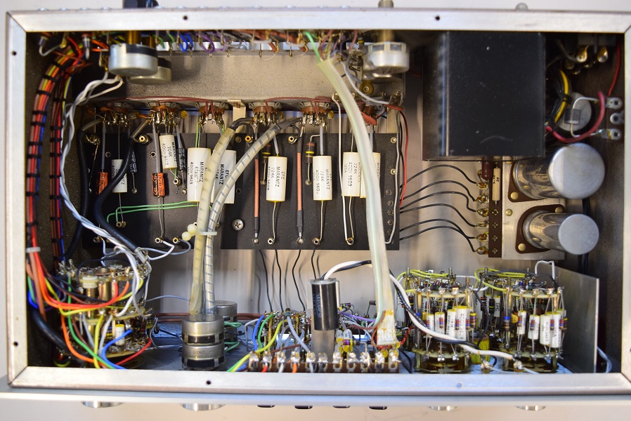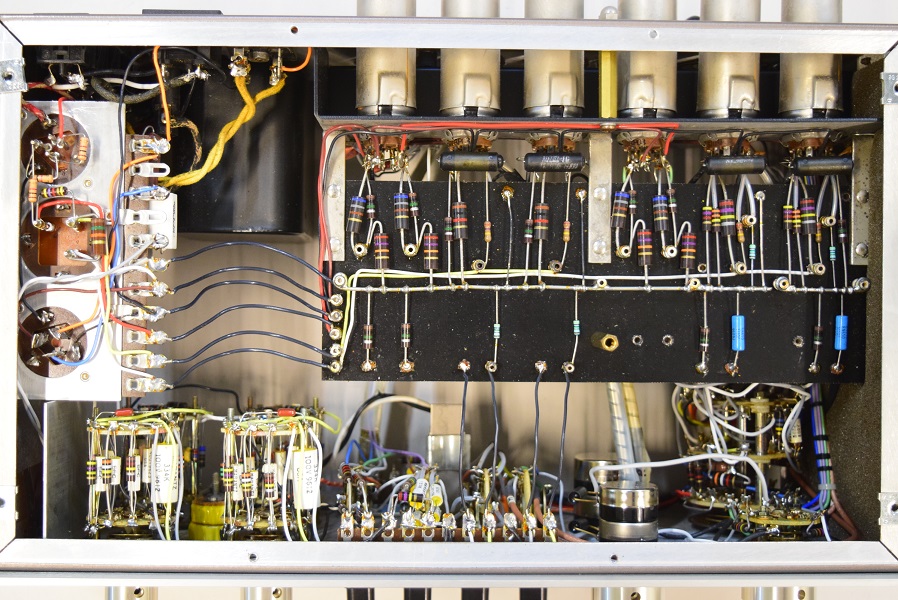 レストア後の内部です。全てのカップリングコンデンサーはいつもの黒いUSA仕様に交換しました。フォノイコのカソードバイパスコンも純正SPRAGUEの新品に交換しました。