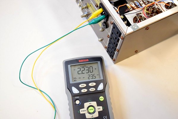 電源が入らないとの事なので、まずは電源トランス1次側巻き線のインダクタンスを測ります。測定値の通りインダクタンスは安定せず不定値であり1kHzの交流抵抗値も不定です。この為、電源トランス1次側の断線と断定します。ヒューズは切れていません。