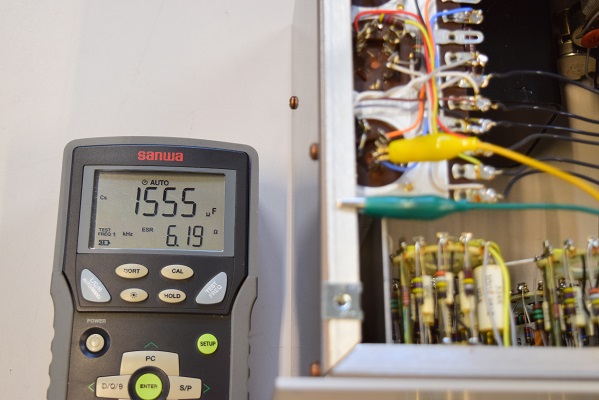 電源回路の電解ブロックコンデンサーのチェックです。まずは高圧先頭φ25です。全ブロックで完全に容量が抜けています。