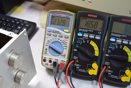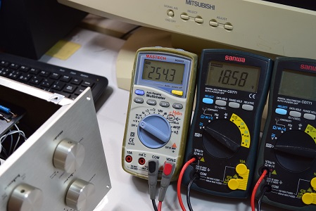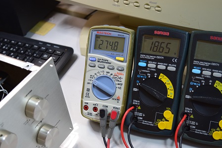 左の白テスターは高圧B1です。 274.8Vを示し極めて良い値です。中央のテスターはヒーター電圧です。こちらも18.65Vで良い値です。