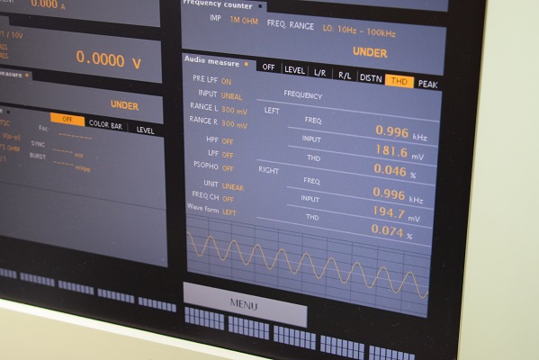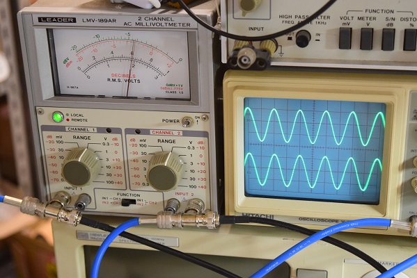 左右の出力波形のチェックです。綺麗な波形が出ています。周波数特性も良好です。