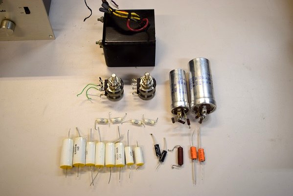 交換部品です。電源トランスやボリュームなど珍しい部品も交換しました。