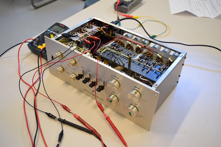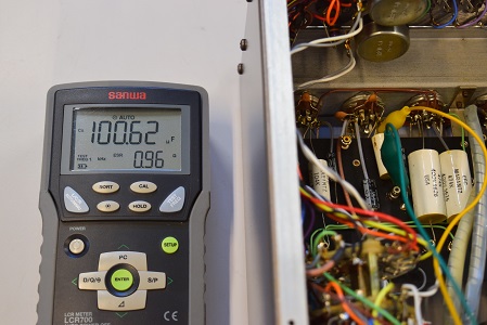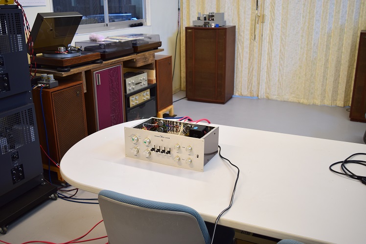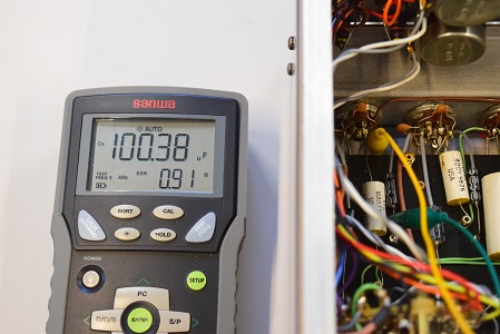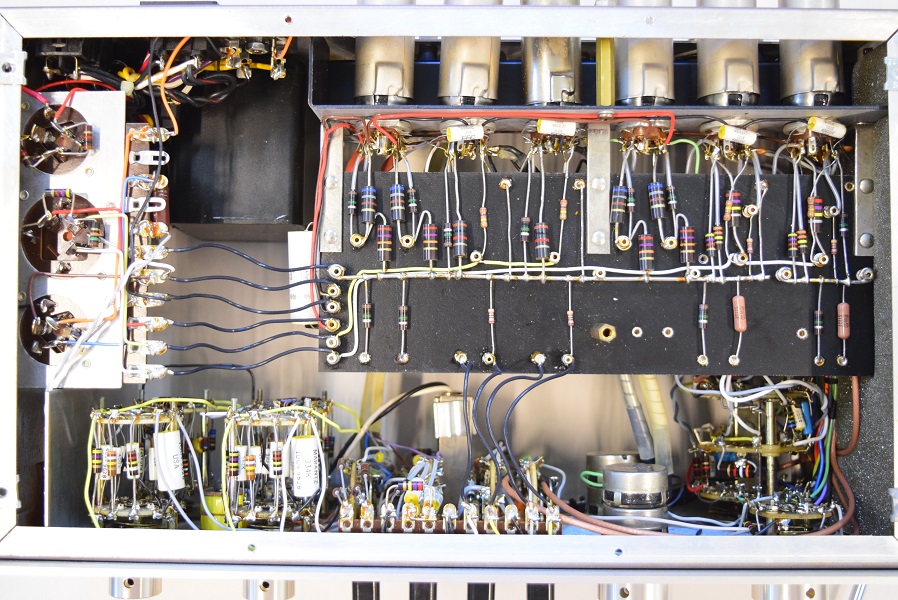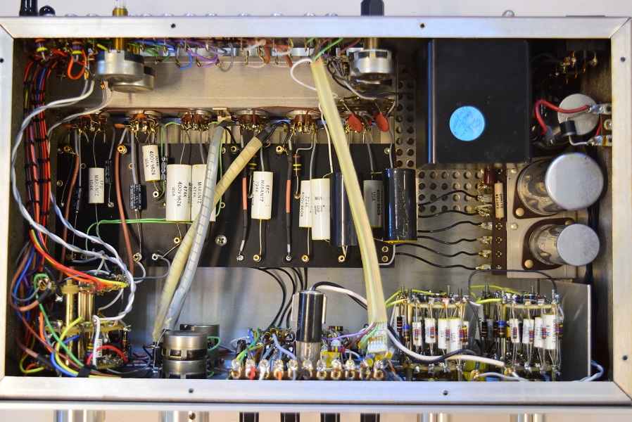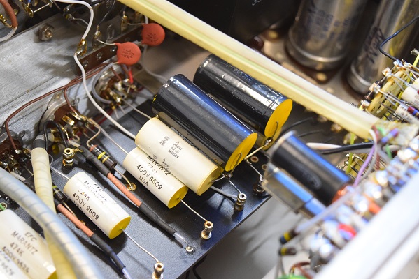 内部です。今回は電源が良い状態なので各回路を中心に劣化したコンデンサー類を交換しています。各カップリングコンデンサーは全て音の良いUSA仕様に交換しました。フォノイコのRIAA偏差コンデンサーは正確な値のマイカコンに交換しました。ラインのセラミックコンデンサーはオリジナル純正SPRAGUEの新品に交換しています。